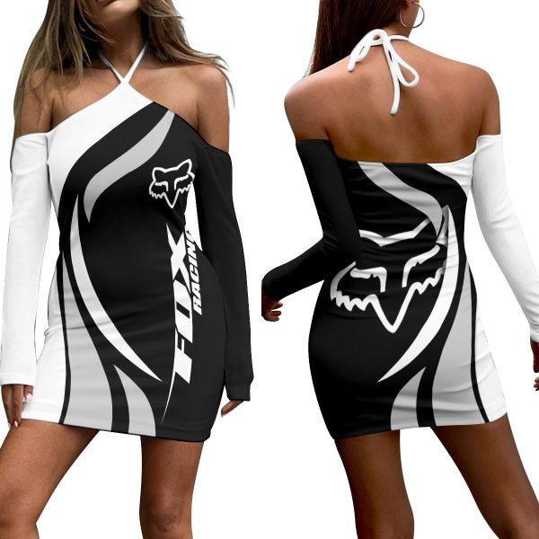 The dress features a cropped cut, off-the-shoulder detail with long sleeves, a halterneck, stretch, and lined. It’s a sexy women’s dress